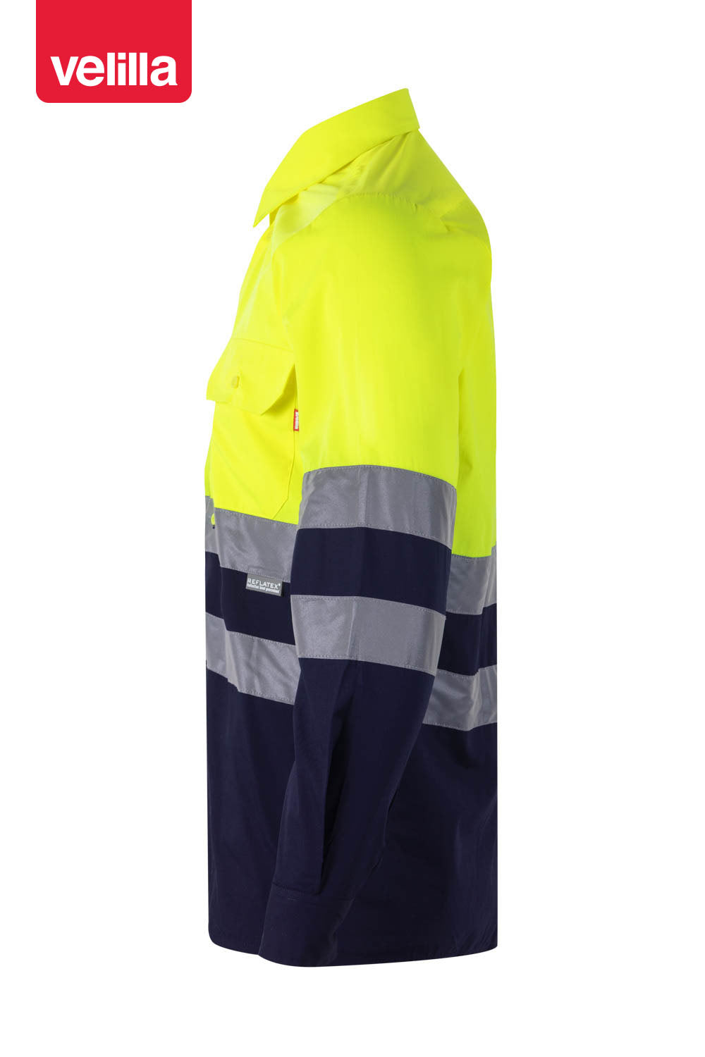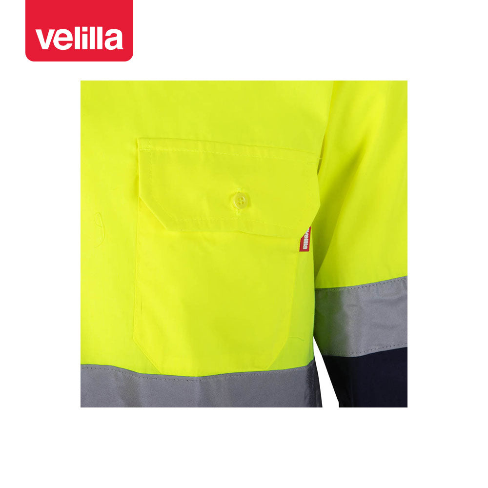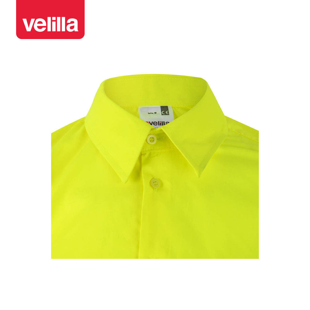 Camisa de alta visibilidad combinada en manga larga, con dos bolsillos en el pecho que cierran con tapeta. Lleva dos reflectantes en cuerpo y mangas, y los puños cierran con botón.