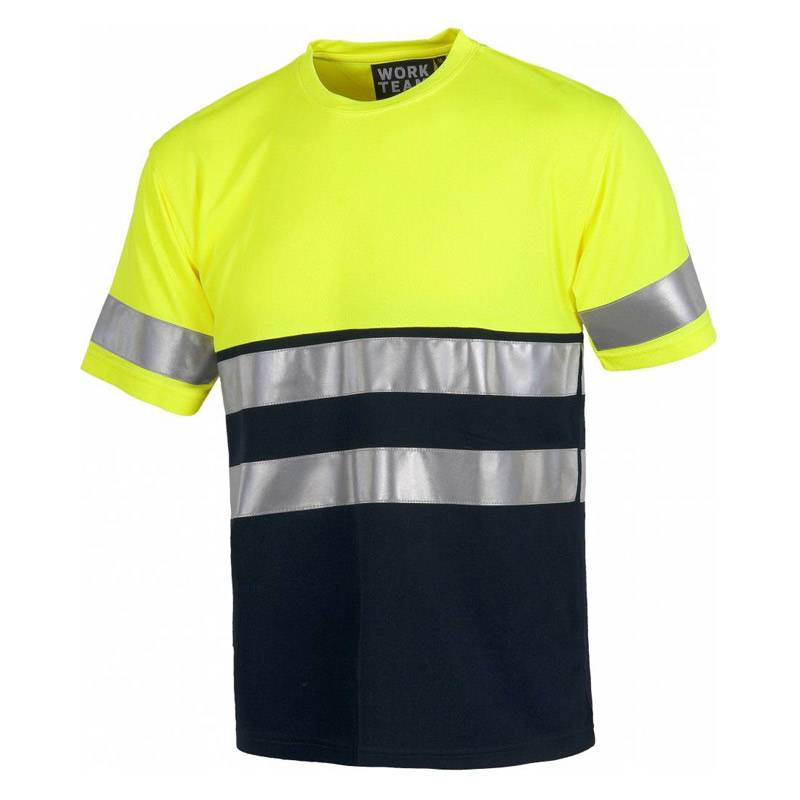 La camiseta bicolor de manga corta esta fabricada esta indicada para temporada de verano, debido a su tejido fino y transpirable. Además, esta disponible en varios colores que combinan con cualquier marca o logo. Bicolor short sleeve shirt without pockets, two reflective tape on chest and sleeves. EN471 Class 1/2 Composition: 100% Polyester