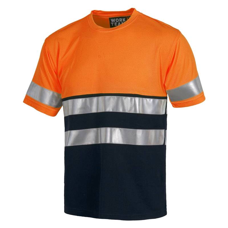 | La camiseta bicolor de manga corta esta fabricada esta indicada para temporada de verano, debido a su tejido fino y transpirable. Además, esta disponible en varios colores que combinan con cualquier marca o logo. Bicolor short sleeve shirt without pockets, two reflective tape on chest and sleeves. EN471 Class 1/2 Composition: 100% Polyester |